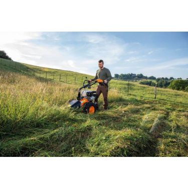 Schneller Wechsel von Anbaugeräten: Mit nur zwei Schrauben werden die Anbaugeräte an der Kupplung des Geräteträger befestigt. Der Wechsel auf ein anderes Anbaugerät, z.B. Kehrbürste oder Schlegelmäher benötigt nur wenige Minuten. Ein Maschinenständer des Geräteträgers erleichtert die Montage.