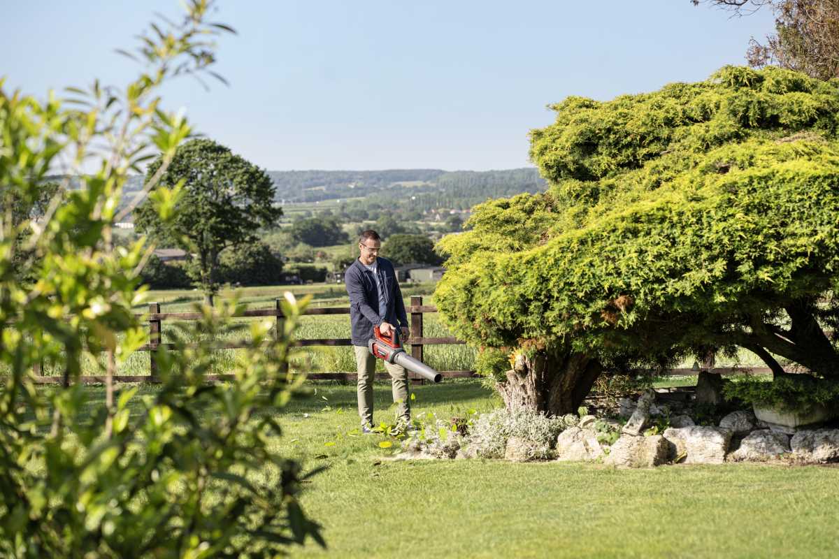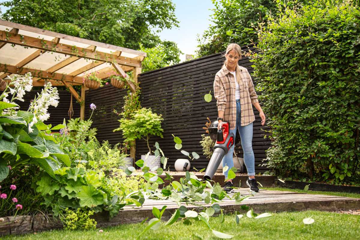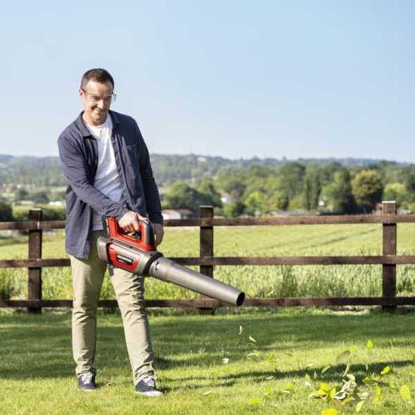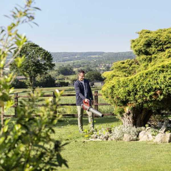 Leichter, akkubetriebener Laubbläser mit beeindruckendem Luftstromvolumen und stufenloser Geschwindigkeitsregelung. Im Set mit 2 Ah-Akku und Standardladegerät.