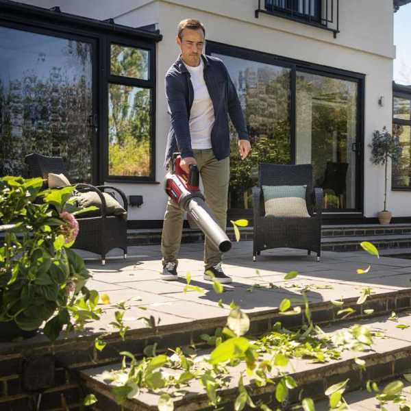 Das Axialgebläse und die runde Düse sorgen für einen kräftigen Luftstrom, mit dem sich schweres Laub und Grasschnitt wirksam beseitigen lassen. Die Geschwindigkeit lässt sich zwischen 100 und 200 km/h einstellen.