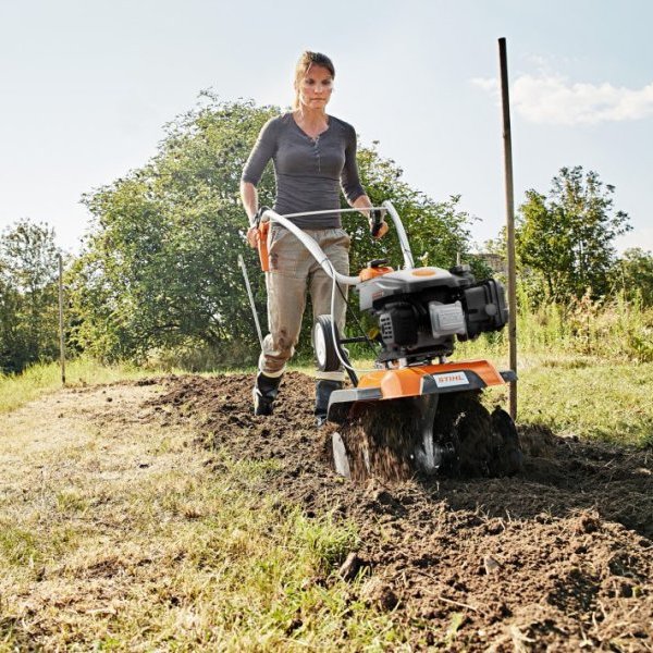 Mittels der beiden Handgriffe lässt sich die STIHL Motorhacke lenken. In Griffweite zu diesen befindet sich die Gasbetätigung, sodass während des Steuerns zugleich per Daumen der Drehzahlregler am Holm bedient werden kann. Dadurch lässt sich die Leistung der Motorhacke beim Umgraben exakt dosieren.