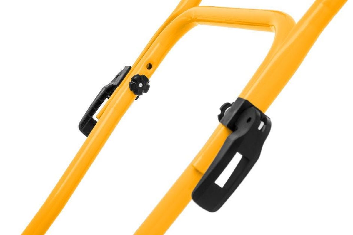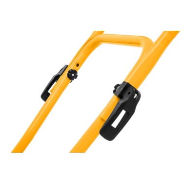 Die robuste Vorderseite aus Kunststoff schützt den Mäher vor Stößen und Hindernissen. Nach getaner Mäharbeit ist der Mäher dank klappbarem Holm und dem ideal platzierten Tragegriff leicht zu transportieren und zu verstauen.