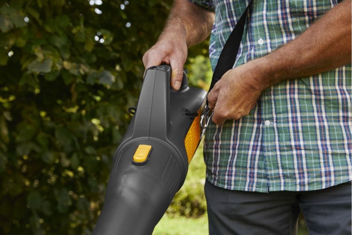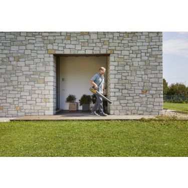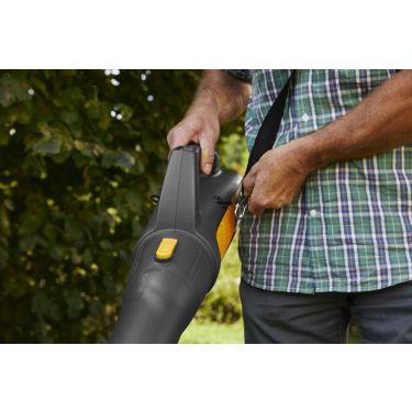 Bei einem Gewicht von nur 2,7 kg ist der Laubbläser sehr leicht zu handhaben. Der ergonomische Griff mit Soft-Grip-Oberfläche verbessert die Manövrierfähigkeit, und an dem praktischen Haken kann ein Tragegurt angebracht werden.
