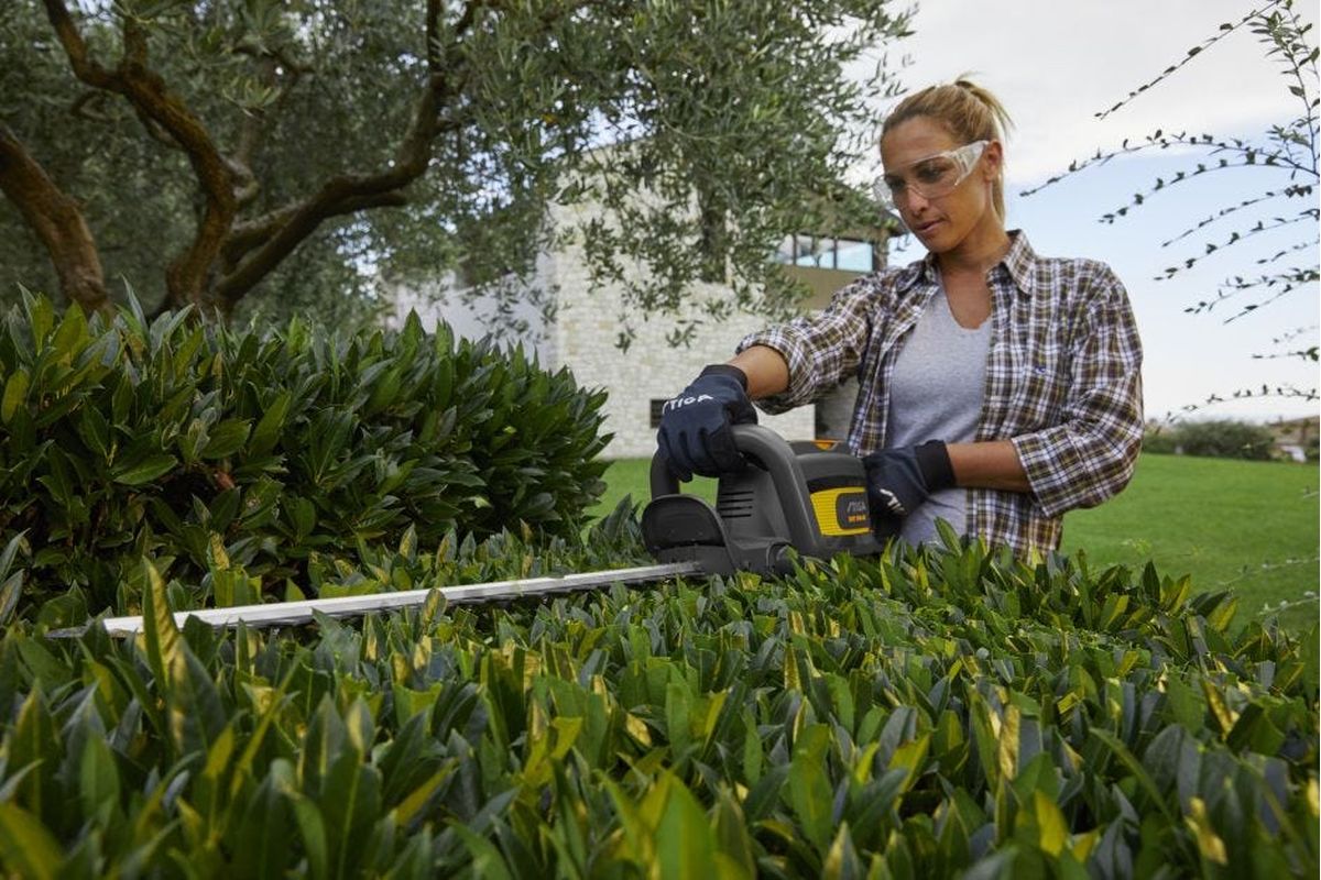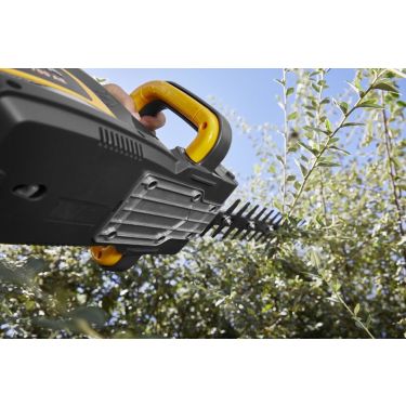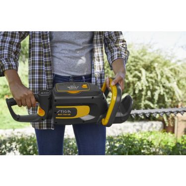 Der leicht zu erreichende Schalter am Griff und der hintere Auslöser sind intuitiv und sicher zusammen zu bedienen, der Handschutz optimiert die Sicherheit bei der Arbeit mit der Heckenschere. Zudem verfügt sie über eine praktische Aufhängvorrichtung.